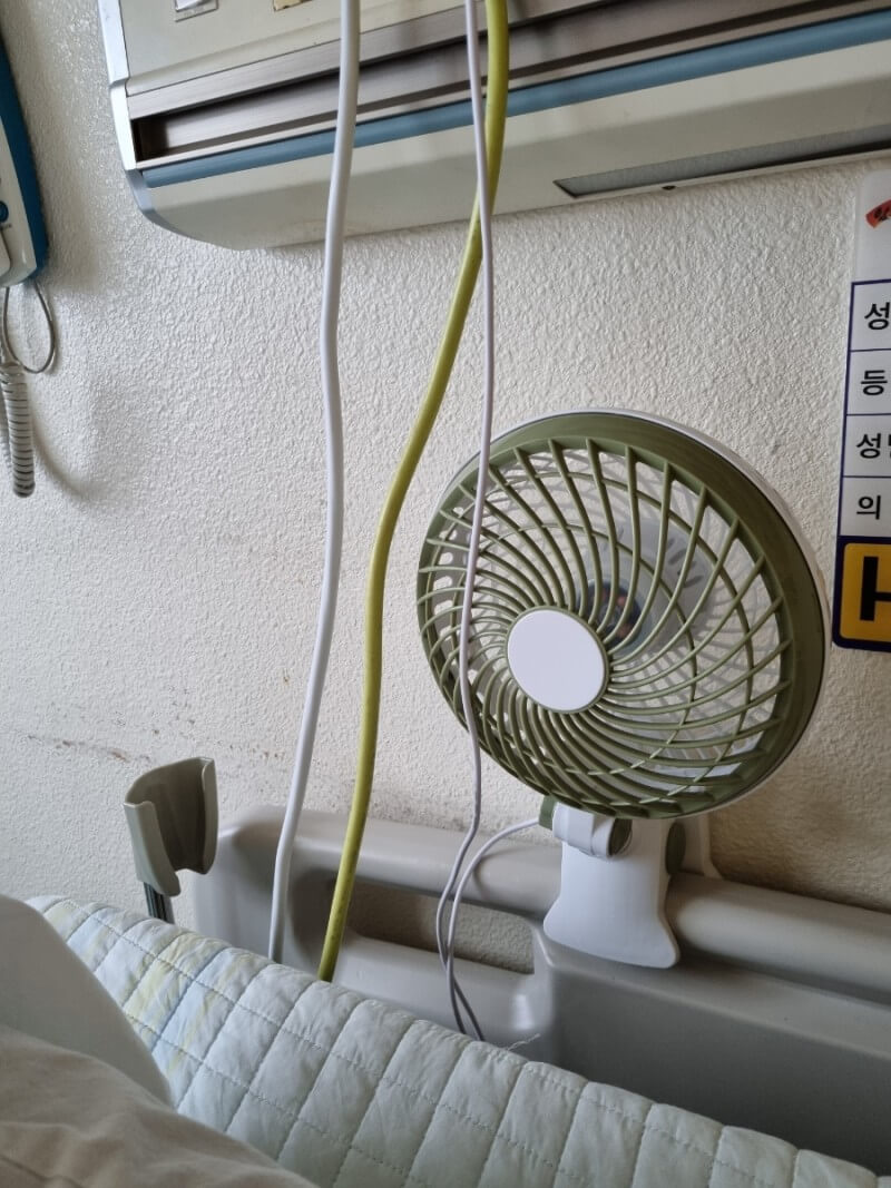 항암치료를 시작하면 냄새에 민감해 집니다. 그렇지만 다인실에 입원하게되면 어쩔수없이 다른 환자들로인해 냄새로 고통받을 수 있습니다. 특히 제가 항암치료를 받았던 원자력병원은 골육종 환자가 항암치료를 받을때 혈액종양내과가 아니라 정형외과 병동에서 치료를 받았기 때문에 수술환자들과 같은 병실을 쓸 때 냄새때문에 힘들었을 때가 있습니다. 이때 도움을 받았던 것이 다이소에서 구매한 선풍기 입니다. 5천원에 구입해서 입원기간 내내 유용하게 사용했습니다. 나중에는 한개 더 구입해서 두개를 침대 바에 꽂아놓고 사용했습니다. 얼굴쪽으로 선풍기를 틀어놓으면 주변에서 나는 냄새가 코에 들어오지 않게 할 수 있기 때문입니다. 게다가 항암치료를 받을 때 다인실에서는 마음대로 에어컨을 틀기 어려웠기때문에 온도를 낮추기 위해서도 선풍기를 유용하게 사용했습니다. 열이 나는 경우에도 차가운 물수건을 머리에 얹고, 선풍기를 틀어놓으면 효과가 좋았습니다. 그와 마찬가지로 에어컨을 너무 세게 트는 병실에 있을때는 한여름인데도 추위가 느껴져서 그때는 전자레인지에 돌리는 찜질팩을 사용했습니다. 뿐만아니라 항암치료 부작용으로 관절 통증이 있어 손목이 아플때도 수시로 찜질을 해주면 통증이 많이 줄어들어서 입원할때마다 꼭 챙겨다녔습니다.