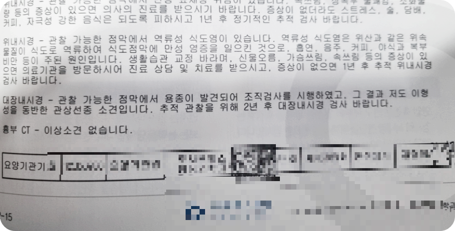 얼마전 남편이 몇 년만에 큰맘먹고 위내시경 및 대장내시경을 받았고, 오늘 결과지를 받았습니다. 내시경 끝나자마자 식도염이 심하다고 약을 처방받아오기도 했는데, 결과지를보니 역류성 식