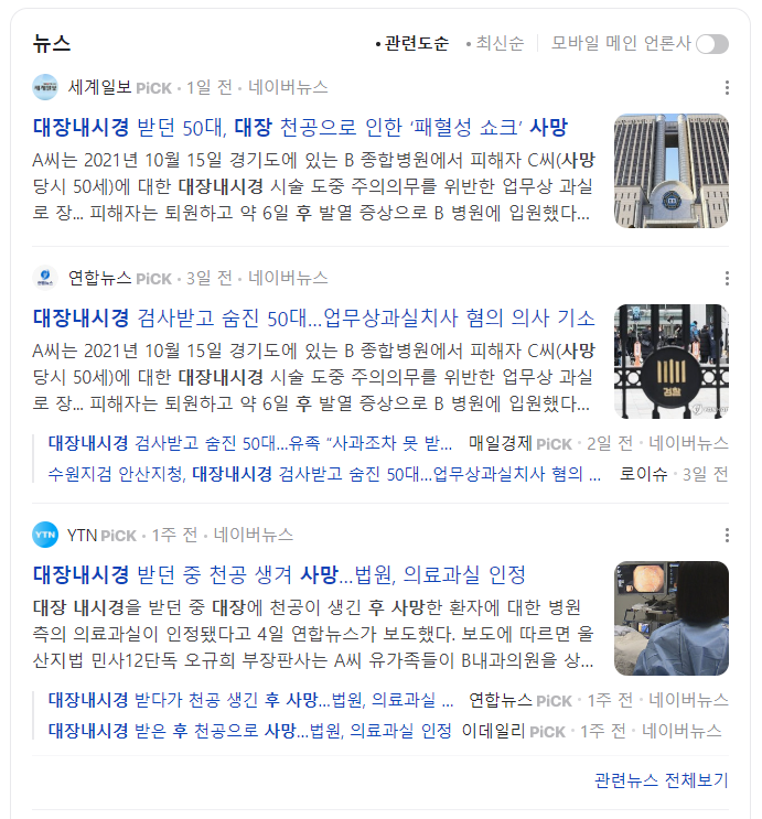 최근 기사에서 대장내시경 검사를 받고나서 대장 천공으로 인해 사망한 환자에 대한 기사가 나오기도 했는데요, 이처럼 대장내시경 후 후유증이 발생하는 경우도 있으니 관련 증상이 있는지 면밀히 관찰하셔야 합니다.
