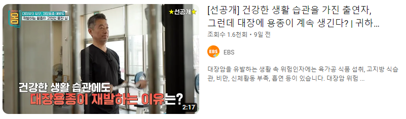 일반적으로 식습관 개선이나 주기적인 대장내시경으로 대장암을 예방할 수 있다는 내용은 자주 들어봤는데, 최근에 방영된 ebs귀하신 몸에서는 대장용종을 예방할 수 있는 방법을 알려준다고해서 유심히 보았습니다. 가공식품, 글루텐, 비만, 음주, 담배, 스트레스가 대장암을 유발한다는 사실은 모두 아시죠? 이것 뿐만 아니라 대변이 장에 머무는 시간이 길어지면 발암 물질과의 접촉 시간이 길어지게 되고 이게 대장용종(대장암) 발생 위험을 높일 수 있다고 합니다. 그렇게 때문에 대변이 장에 머무는 시간을 줄이기 위해 식이섬유를 충분히 섭취하고, 규칙적인 운동으로 대변의 활동을 활발하게 해주어서 대변이 장을 통과하는 시간을 짧게 만들어주는 것이 중요하다고 합니다.