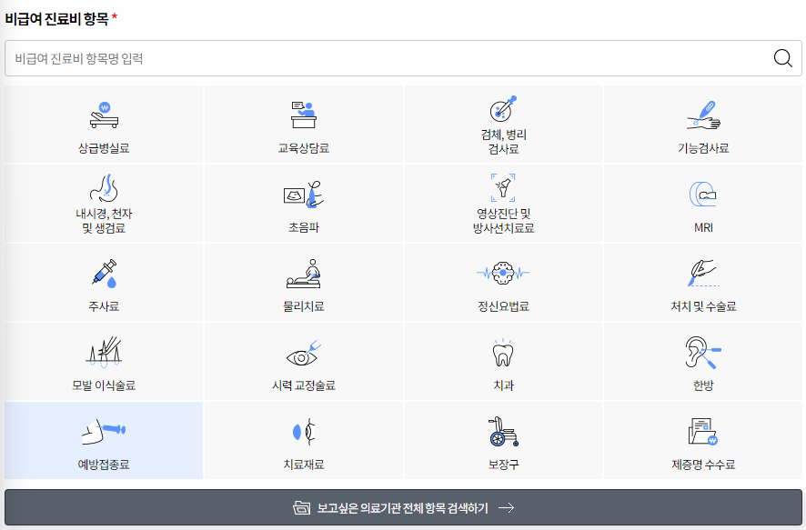 3. 아래 사진처럼 비급여 진료비 항목에서 예방접종료 선택 후 A형간염 선택