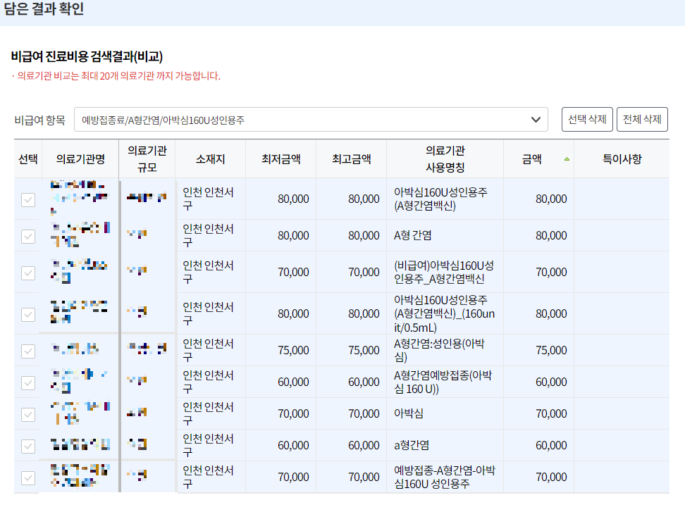 A형간염 예방접종 가깝고, 저렴한 병원 검색 예시