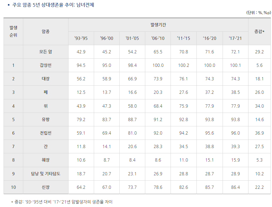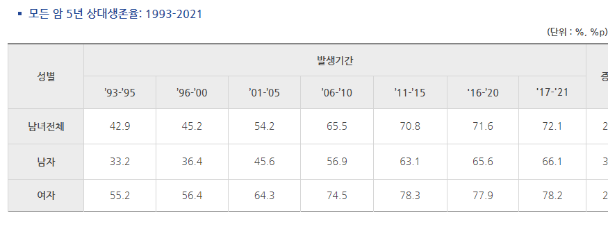 가장 최근의 통계 산출 기간은 2017년부터 2021년까지 5년간 발생한 암환자의 5년 상대생존율인데 이 수치는 72.1%라고 합니다. 즉 10명 중 7명 이상이 5년 이상 생존하는 것으로 추정되었습니다. 이 수치는 그전 통계와 비교했을 때 무려 17.9% p 증가된 수치라고 하니까 매년 의학기술이 발달하면서 암 생존율도 높아진다고 볼 수 있을 것 같습니다.