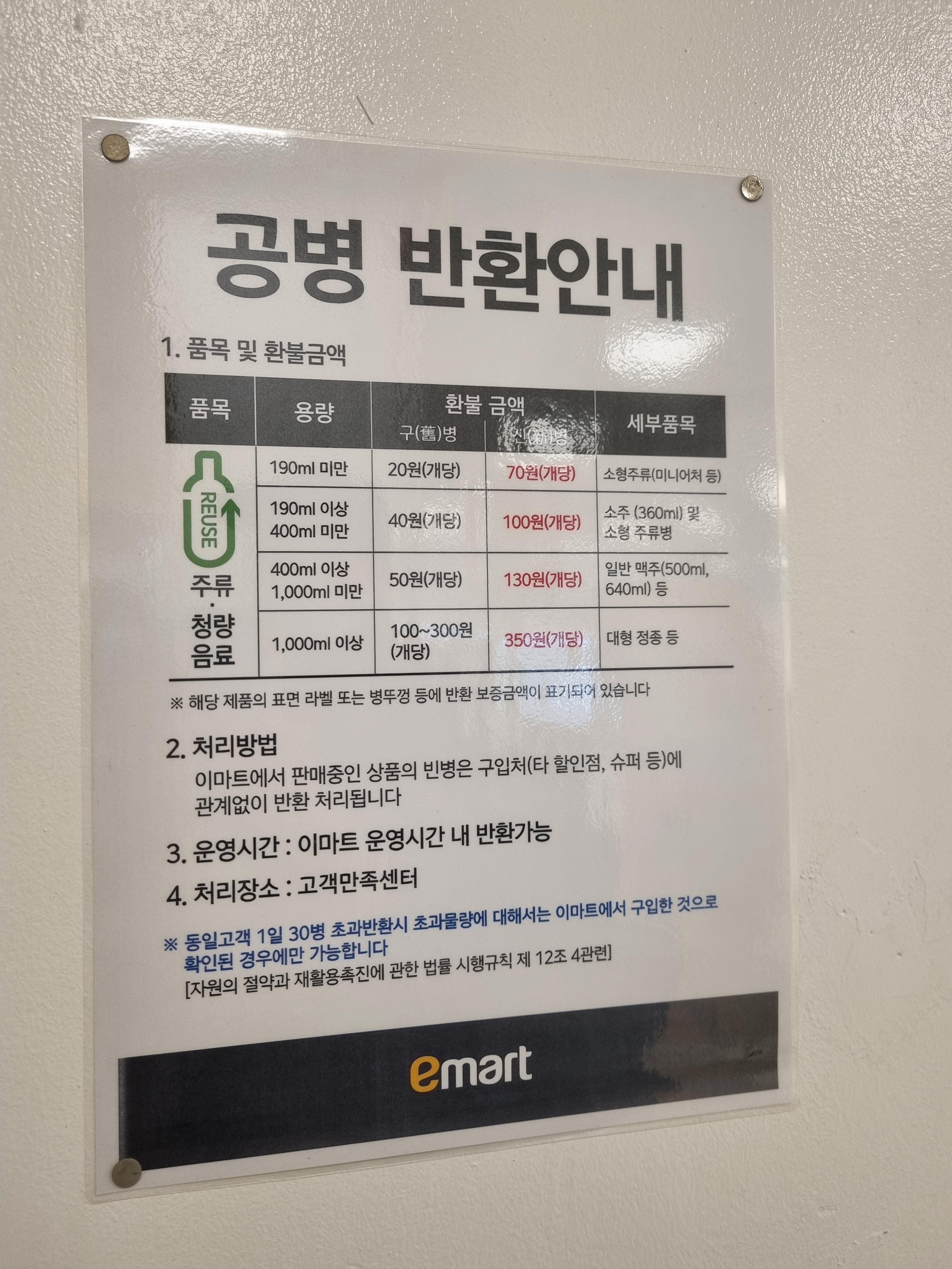 안내데스크에 도착하시면 바로 번호표를 뽑고 대기하시면 되는데, 공병 판매에 관한 안내사항이 벽에 붙어있으니 참고하시면 좋습니다. 공병 반환시 환불 금액은 보증금액이 병에 적혀있으니 병을 많이 가져오시는 분들은 미리 계산해서 총 금액을 안내데스크에 알려주시면 더 신속하게 반환이 가능합니다.