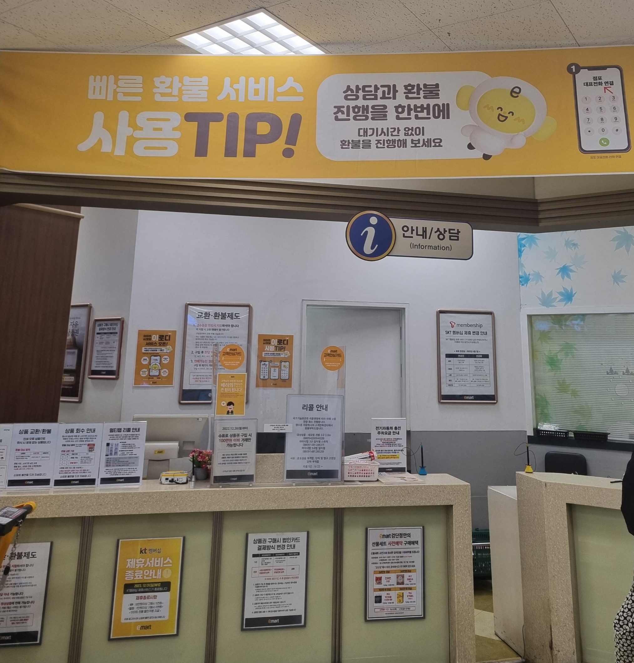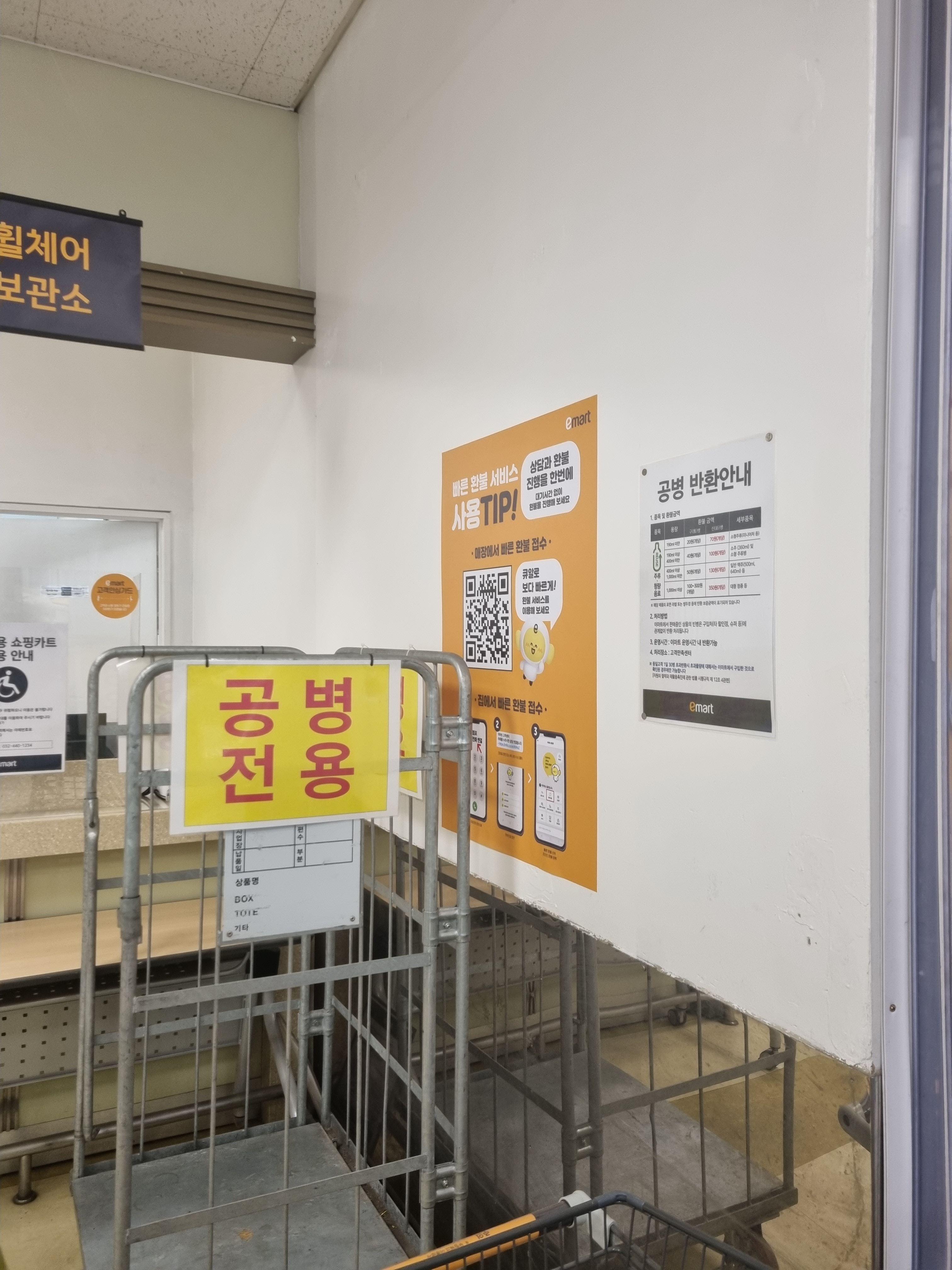 기계가 있는지 검색하다보니 네이버 블로그에 2023년 이마트 검단점 공병 판매 후기가 있어서 보고 갔는데 그 후기에서는 안내데스크가 아닌 바깥 주차장 입구쪽에 공병 반환장소가 따로 있다고 적혀있어서 한참 찾았는데, 알고보니 그 사이에 정책이 바뀌어서 이제는 바로 안내데스로 공병을 가져가시면 됩니다.