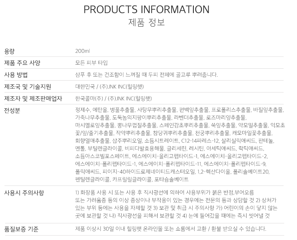 암환자들을 위한 브랜드 힐링햇에서 나온 제품이니 당연히 성분은 좋겠지 하는 마음으로 구매했는데, 역시나 뿌려보니 인공향도 없고 일반 물같은 성질이라서 두피에 부담없이 뿌리기에 간편하다는 점이 마음에 들었습니다. 사진에서 보시다시피 골고루 분사가 잘되는데다가 양이 많아서 항암치료 종료 4개월차인 지금까지도 사용하고 있으니 그걸 고려하면 39000원이라는 가격도 정말 혜자인 것 같습니다.