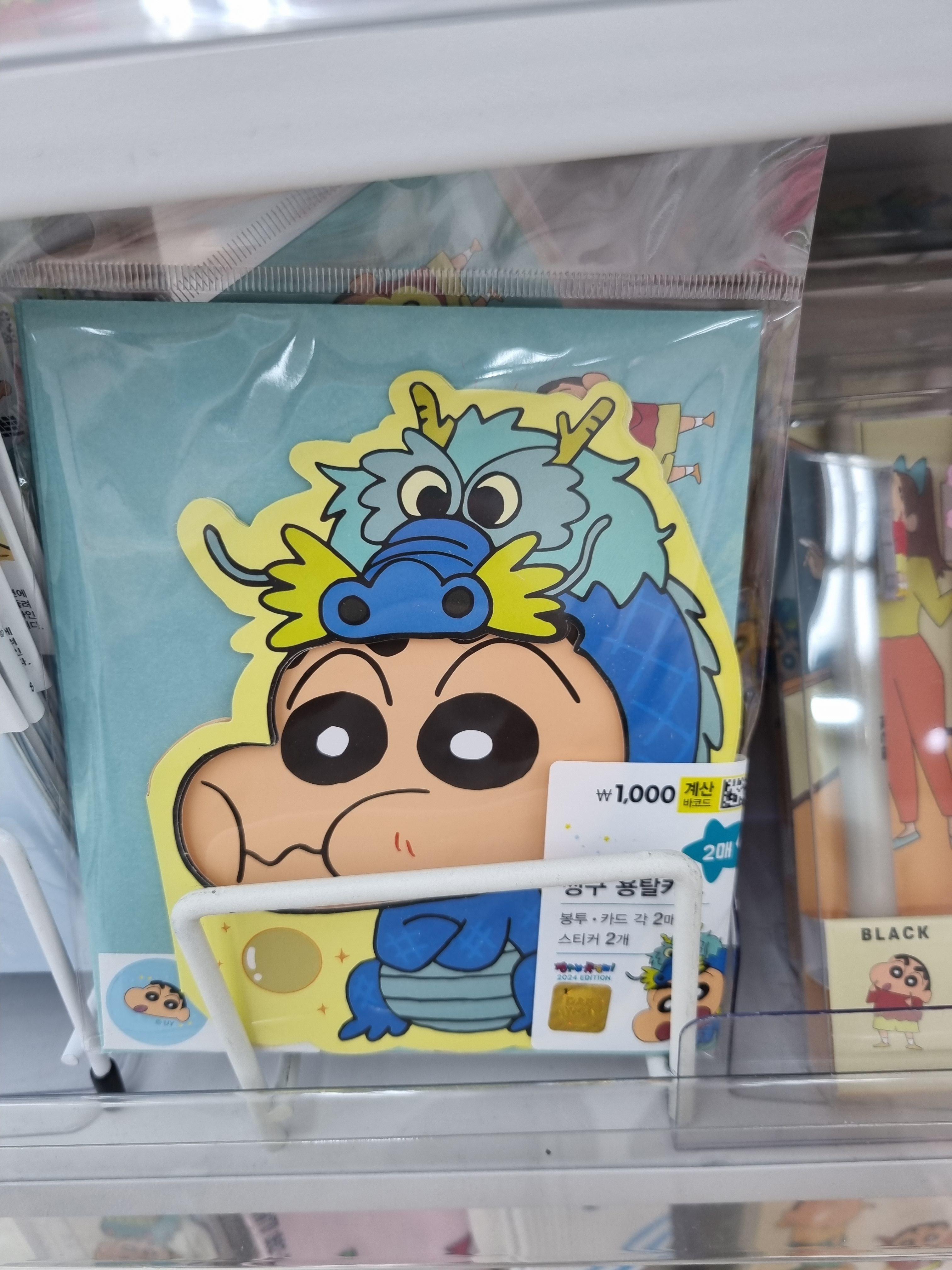 이건 새로나온 짱구 클리어화일과 카드입니다. 클리어화일 2개가 한세트라서 가성비가 너무 좋아요. 예전에 대형문구점에서 비슷한 짱구 파일을 한개에 이천원에 구매했는데 이제 다이소에서 출시되어서 반의 반값인 2개 천원에 구매할 수 있습니다.