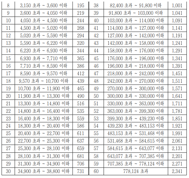 | 336만원 초과 ~ 7억1,776만원 이하 | 95.25911708 + (336만원을 초과하는 소득 1만원당 1만분의 2,835.0928) |